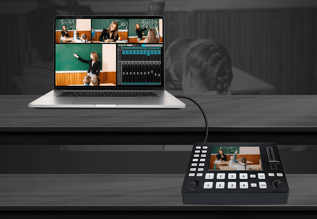 Along with HDMI inputs, you can use RJ25 Ethernet cables for PTZ camera control, audio input for microphones, and USB storage for recording.